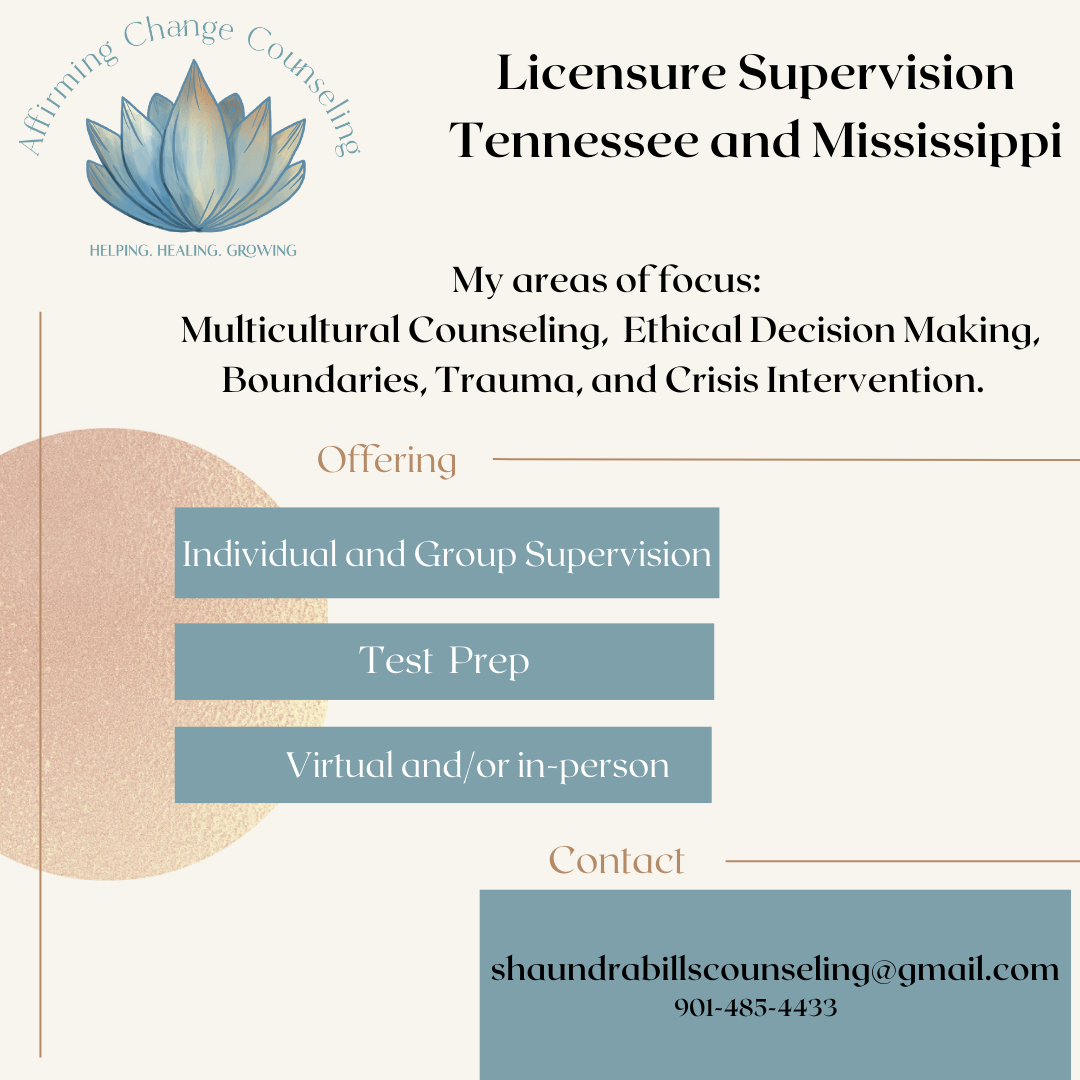Licensure Supervision is offered by Shaundra Hardaway, for those seeking LPC-MHSP licensure in Tennessee. or their LPC licenses in Mississippi. Supervision includes individual and group supervision as well as test prep for supervisees who are preparing to take their licensing exams.